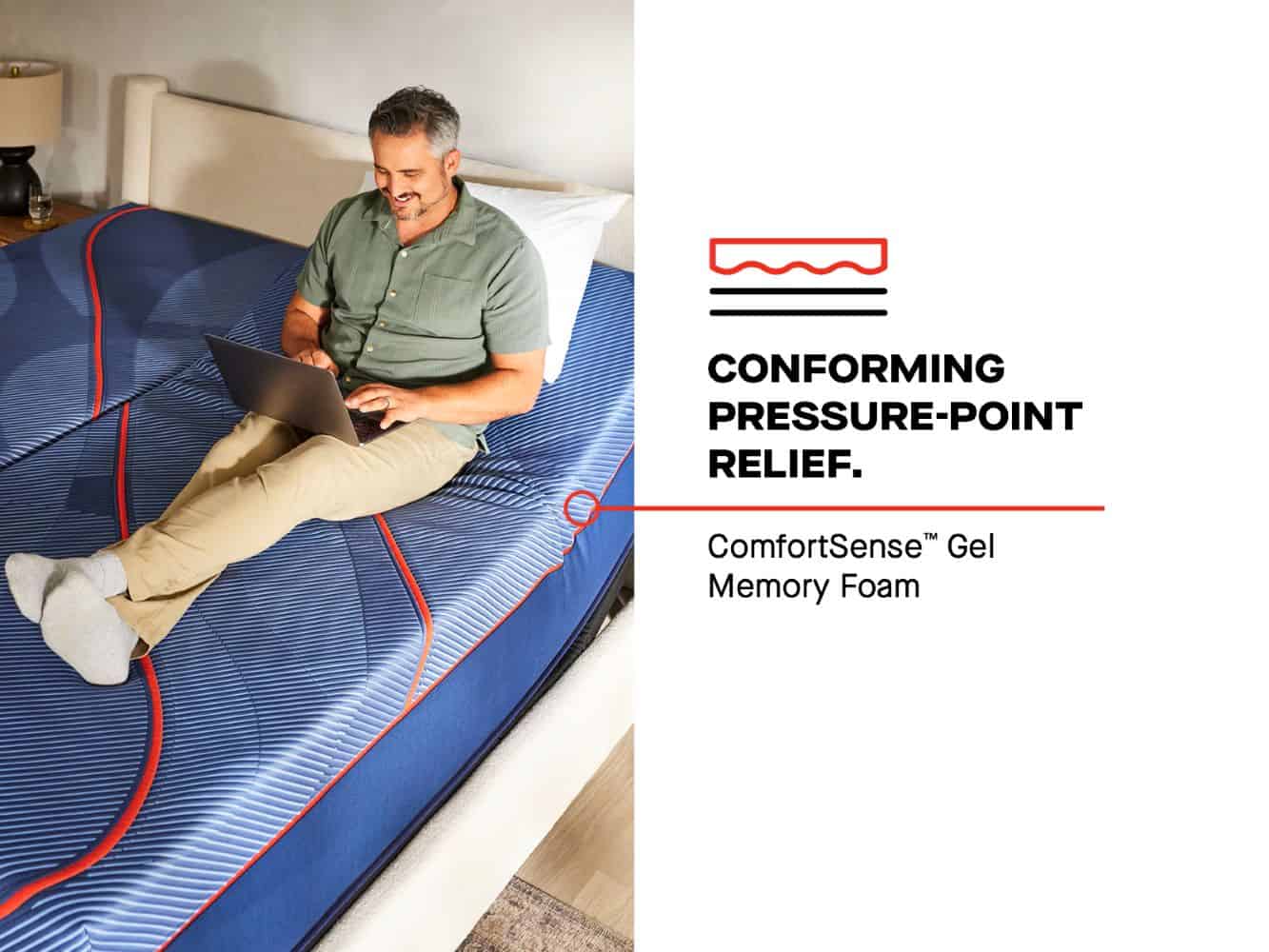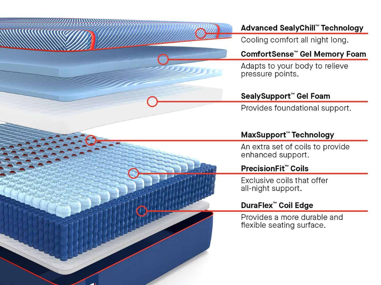 The hybrid design includes SealyComfort™ Gel Memory Foam for pressure relief and ComfortSense™ Gel Memory Foam to ease pressure points. Advanced SealyChill™ Technology in the cover and top foam layer provides an up to 40% greater cool-to-touch feel than Sealy Posturepedic® Plus.