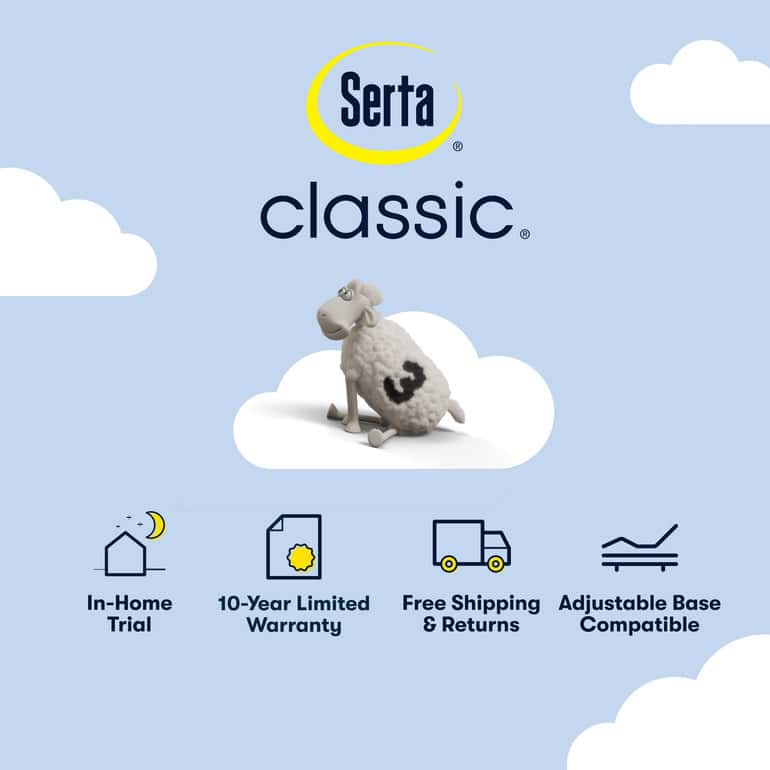Experience the trusted comfort of Serta with Serta® Classic® Featuring a soft, breathable cover, PillowSoft® Aire foam, and an 800-density coil support system, this mattress helps you sleep comfortably and wake ready to ease into your day. With 3 zones for lower back support, plus a Gel Memory Foam upgrade for even more pressure relief, this mattress balances cool breathability with responsive support and pressure relief for a classically comfortable rest. Breathable cover helps you sleep and wake refreshed. 3 zones provide support across your lower back and hips. Gel Memory Foam increases pressure relief for all-night comfort.
